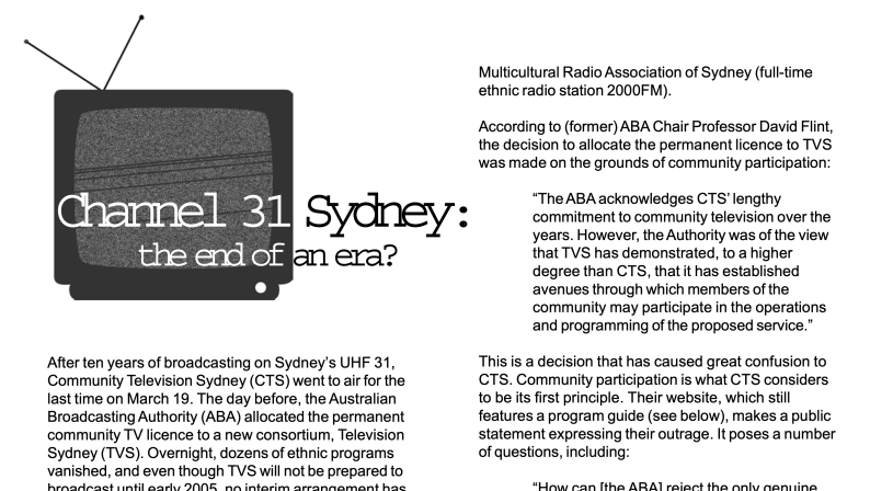 After ten years of broadcasting on Sydney’s UHF 31, Community Television Sydney (CTS) went to air for the last time on March 19. The day before, the Australian Broadcasting Authority (ABA) allocated the permanent community TV licence to a new consortium, Television Sydney (TVS). Overnight, dozens of ethnic programs vanished, and even though TVS will not be prepared to broadcast until early 2005, no interim arrangement has been made to allow CTS and its communities to remain on air. How and did this happen? Why? And what happens to the ethnic broadcasters?