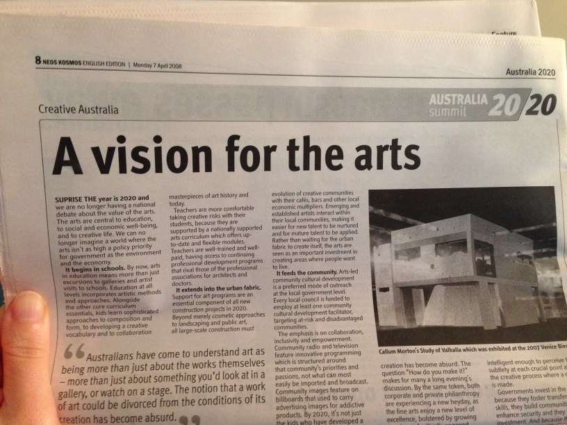 It feeds the community. Arts-led community cultural development is a preferred mode of outreach at the local government level. Every local council is funded to employ at least one community cultural development facilitator, targeting at-risk and disadvantaged communities. The emphasis is on collaboration, inclusivity and empowerment. Community radio and television feature innovative programming which is structured around that community’s priorities and passions, not what can most easily be imported and broadcast. Community images feature on billboards that used to carry advertising images for addictive products. By 2020, it’s not just the kids who have developed a critical vocabulary for analysing the images around them. It’s become very difficult for advertisers and politicians alike to swamp the community with fabricated reasons to spend or vote.