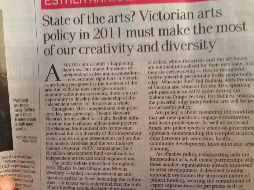 In the words of one prominent voice: “It’s important that we don’t allow the arts to become just a platform of observers; it’s about participation, it’s about artists. And in my view, an active arts community is a community where there’s diversity, where the community is engaging with artists, where they’re welcoming of artists, where the artists and the art forms are not institutionalised for their own sake, but they are ever-evolving they’re thoughtful, they’re powerful, perpetually fresh, perpetually edgy.” Who said that? Ted Baillieu, 46th Premier of Victoria and Minister for the Arts, speaking with passion at an AICV event during the Melbourne Fringe Festival. For Baillieu, trusting the powerful, edgy independent arts will be key to successful policy.