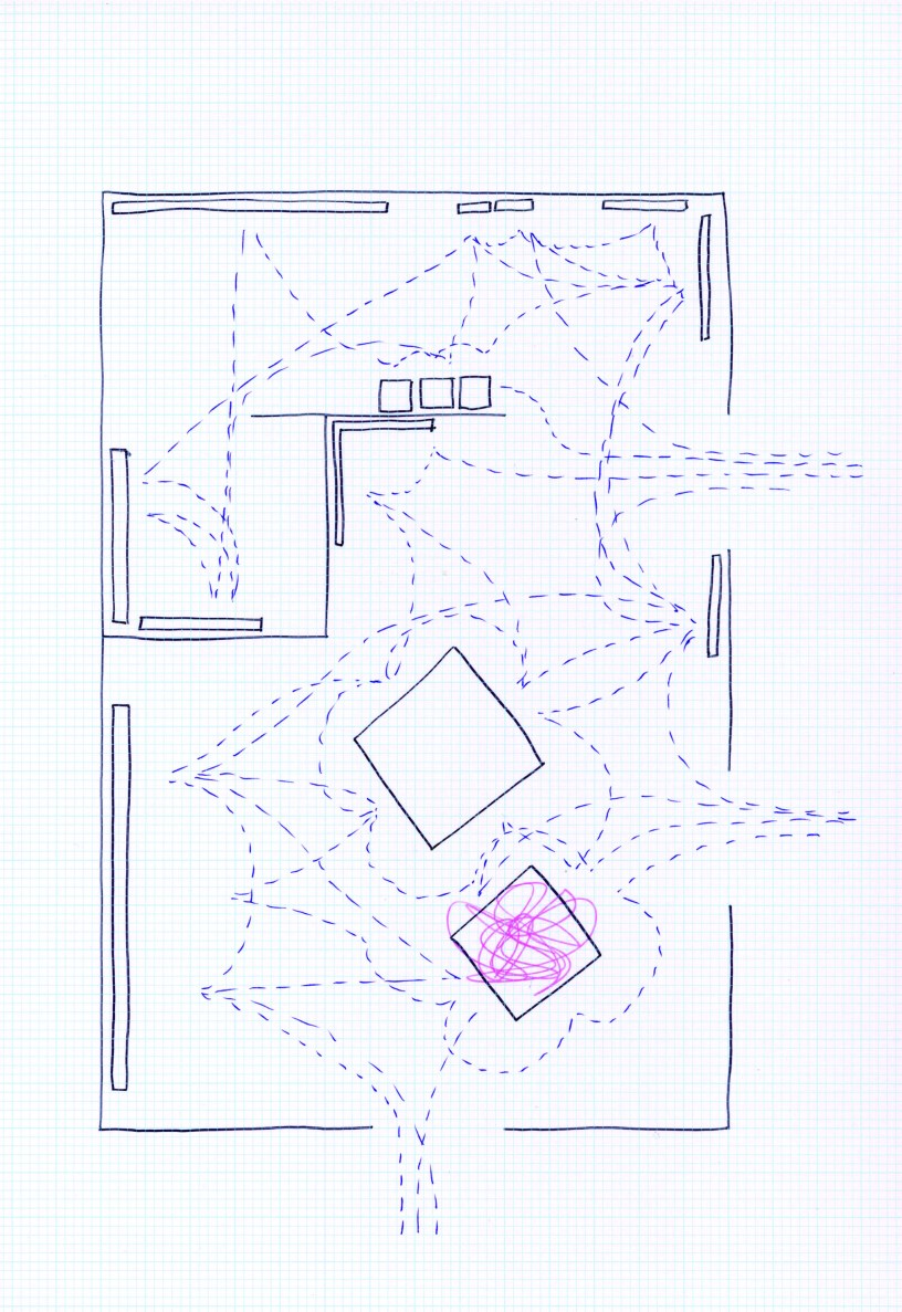 Work makes its own dimensions. The body finds the most comfortable way of rearticulating its movements and repeating its techniques, edging outwards and converging inwards, marking out a perimeter within which all tools are at easy reach, and all the while remaining focused on the work. The work creates a space using the focus of the body. The space of concentration is easily recognisable. We know it and we respect it. We take a step back, slowly, quietly. It has its own sound. The regularity of breath. The tapping or scraping or etching or rustling or folding. In the beginning there was the work. Originary creation, originary difference, originary change. The work is the locus of creative human movement, the momentary centre of all invention at the first person, ever present and demanding. Office workstations abstract this movement into a standardised workflow, privileging a fixed range of techniques for achieving a fixed range of performance indicators. Theatres abstract this movement across a plane, performing the distance between viewer and stage, framed by fabric to conceal the craft. Galleries abstract this movement into a standardised circulation, offering points of resistance inspired by the placement of the work. The work makes its own dimensions. It evokes proscenium in the form of an arch; it demands whitespace in the form of a successful hang; it perches atop a plinth, it lines pages held by careful hands, it plays your personal soundtrack as you dance to the beat. It moves. The work of art gravitates a field, creates a space for exchange, unfolds a seating bank, anticipates a taped line on the gallery floor, commands a focal point in the city square. The best place for the work is the position where it will articulate the space it needs the most. Stand back and take a good look. Instinctively you stretch out a little further, moving your body back and forth, to and fro, taking another step back to take in the work from a broader perspective. Place the work where it will articulate the space it needs, and it will continue to work through each idea.