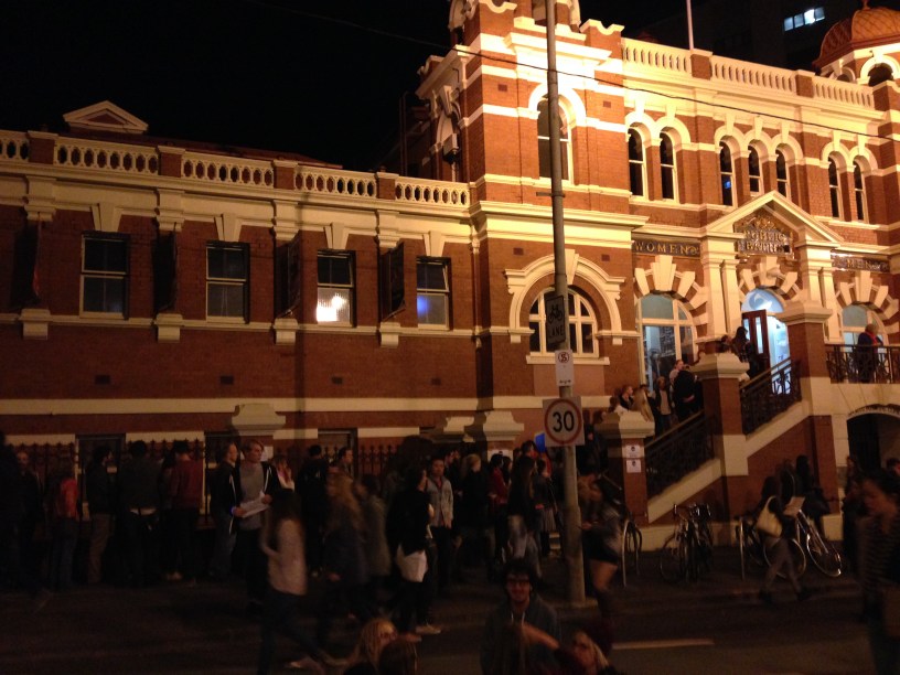 As long as I remained on the north-south axis I was engulfed in happy crowds, patient parents pushing prams, elderly couples holding hands. As the Melbourne International Comedy Festival shows us year after year, the phenomenon of large numbers of queuing people presents its own spectacle, with human bodies making a critical mass of energy and anticipation. The sheer numbers of people walking the footpaths, midnight-picnicking in the middle of the streets, and queuing around corners and along entire city blocks, are a great strength for White Night, not a shortcoming.