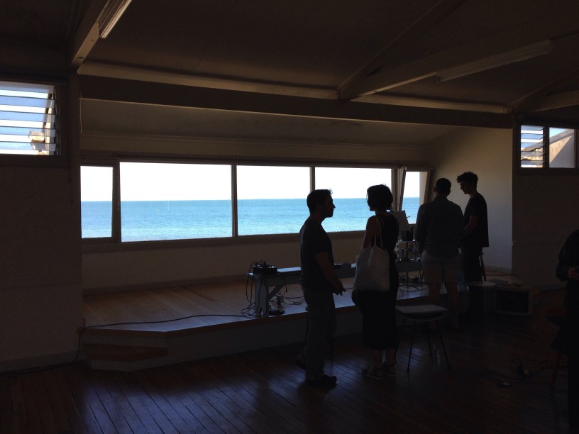 The performance began by preparing the ears, as David Young described it, for the sensitive listening to follow. Rattling plastic cords were pulled to raise blinds set against a long wall of incongruous yet collinear windows, one after the other, with a smoothness unexpected from our all-Australian boat club setting. Once revealed, the bold stripe of sea against sky in the thick blue painted bay arrests us. We have each spent the morning privately recovering our bodies from two days of plus-forty heat, our joints now yearning for the salty relief of the waves and the breeze. We feel our shoulders release and drop, our ears opening just a little more, our eyes focusing for the moment on the stripes of blue and not on the long stripe of a table cluttered by sound-making equipment of tech high and low. Dylan Sheridan is wearing the feathered head of a chicken. We feel what good sense this makes. Margaret was a mouse the last time I saw her. A small mammal. We hear tones, sounds, we listen more carefully than we are hearing, than what we are hearing. We listen collectively.