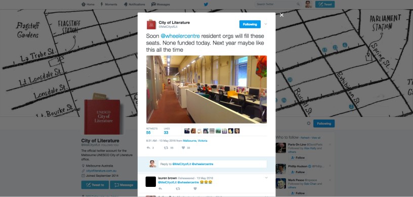 IMAGE: Tweet by David Ryding, Director, City of Literature, Melbourne (@MelCityofLit), on Friday 13 May 2016: “Soon @wheelercentre resident orgs will fill these seats. None funded today. Next year maybe like this all the time.” Screengrab captured today.