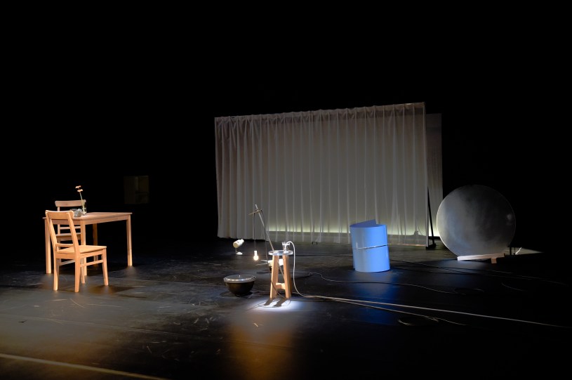 Time’s Journey Through a Room is presented with multiple frames: a narrator who marks out her role for us ahead of each move, so that her performance realises our memory; a couple seemingly engaged in passive-aggressive goading, soon revealed to be the memory of far more tragic a situation; a curtained-off space, a table with chairs, a set of fans and lights, a series of objects.