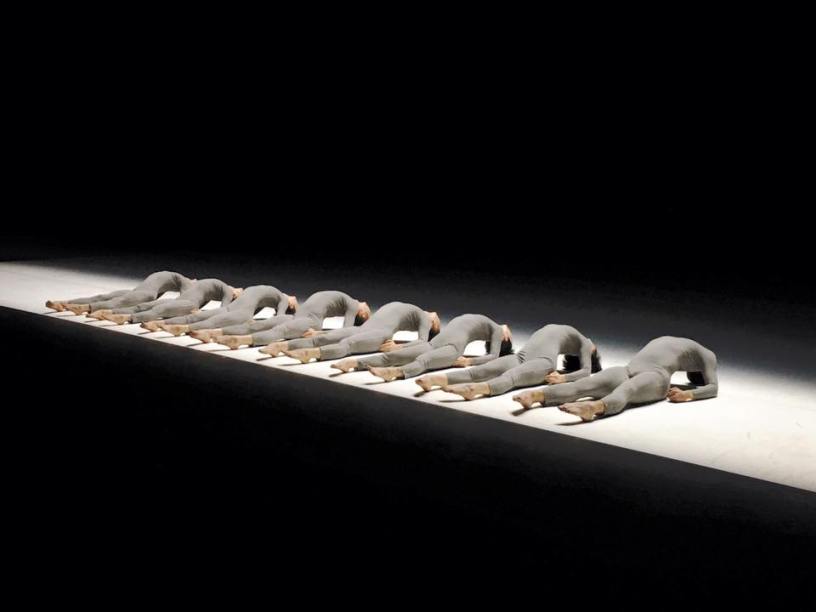 Bodies. Bodies at rest. Bodies in form. Bodies disciplined, bodies strong and powerful, bodies articulating new forms through ligaments and tendons, joints and muscles. Bodies without heads. Bodies arched into torsos, bodies arched into diagonals, bodies arched and bodies at rest. Bodies presented as a series, a frieze in motion, an invitation to observe difference and repetition with rigour. Eight bodies laying parallel to form one plane of spatial exploration with shoulder blades and buttocks for feet.
