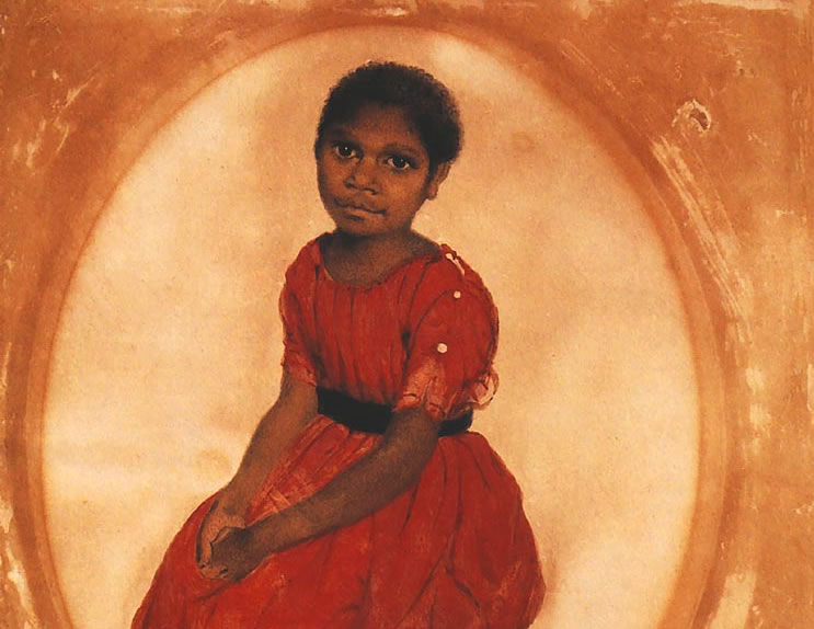 As an Australian story, Mathinna’s is astonishing – both in its tragedy, and in its power to keep inspiring artists to respond. When she was just seven years old, convict artist Thomas Brock painted Mathinna’s portrait in the red dress that Governor Franklin so loved to see her wearing, dolled up like his little princess. In 1967 Nan Chauncy wrote a children’s book of literary non-fiction called Mathinna’s People. Gordon Bennett’s 1998-1999 paintings Home Decor (Relative/Absolute) Flowers for Mathinna #1 and #2 are collages composed of problematic depictions of Aboriginal people made both with and without their permission, with Brock’s 1842 painting a prominent reference. Bangarra presented their version of Mathinna in 2008, choreographed by Stephen Page, and premiering at Arts Centre Melbourne. Bangarra’s work was the result of extensive research and collaboration with Elders, and they produced educational resources aimed at high school students, as well as touring the work regionally. Richard Franklin researched and wrote about her life in his 2008 novel Wanting. In a 2011 interview with Radio National, Franklin was careful to note that his presentation of Mathinna’s story is a fictionalisation, and that others more expert should be consulted on the details of her life. More recently, Palawa artist Nick Kupetsky’s Mathinna, a charcoal portrait shedding a very pronounced tear, was a finalist in the Victorian Indigenous Arts Awards in 2014.