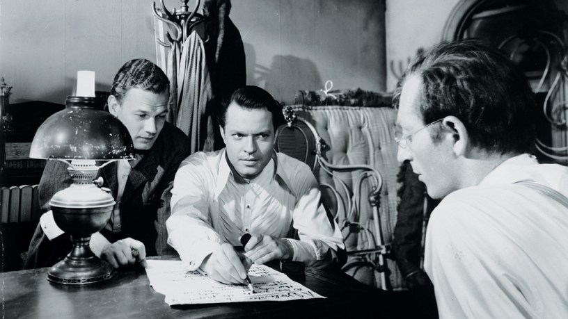 IMAGE: Jed Leland (Joseph Cotten), Charles Foster Kane (Orson Welles) and Mr Bernstein (Everett Sloan), with Kane’s ‘Declaration of Principles’, Citizen Kane (1941). On rejecting the “gold mines, oil wells, shipping and real estate” roles he had just inherited, Kane seizes the opportunity to run a small New York media company “acquired in a foreclosure proceeding”, declaring: “I think it would be fun to run a newspaper.”