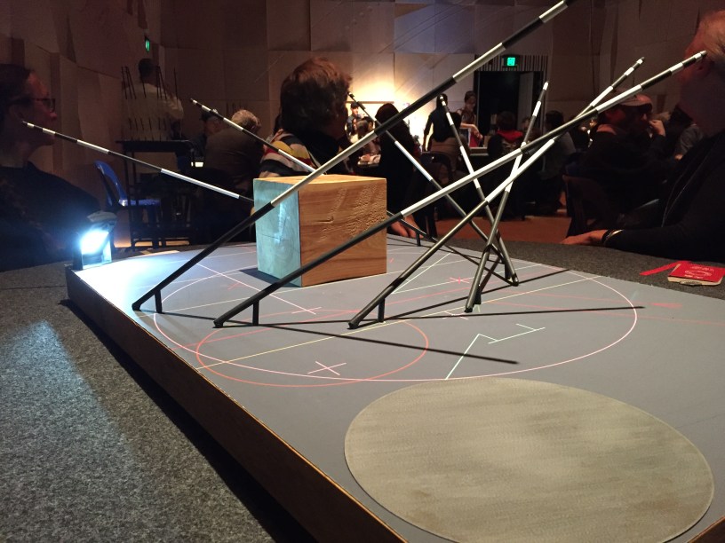 After Between 8 and 9, eight artists rose from eight round tables and eight groups of us applauded and applauded and then stayed to understand the work. We looked at unfamiliar instruments up close; we handled Fibonacci sticks and wooden blocks and steel circles; we felt those tiny moments of delight when magnetic couplings snap into place. We reflected, we talked, and nobody wanted to leave. Finally, well-meaning Recital Centre staff had to interrupt the scene to suggest most politely that it was time to disperse.