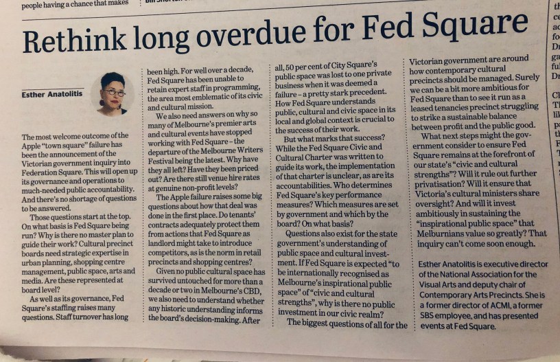 We also need answers on why so many of Melbourne’s premier arts and cultural events have stopped working with Fed Square – the departure of the Melbourne Writers Festival being the latest. Why have they all left? How have their contracting arrangements changed across FedSquare’s history? Have they been priced out? Are there still venue hire rates at genuine non-profit levels? How does that align with Fed Square’s obligations under its Civic and Cultural Charter?