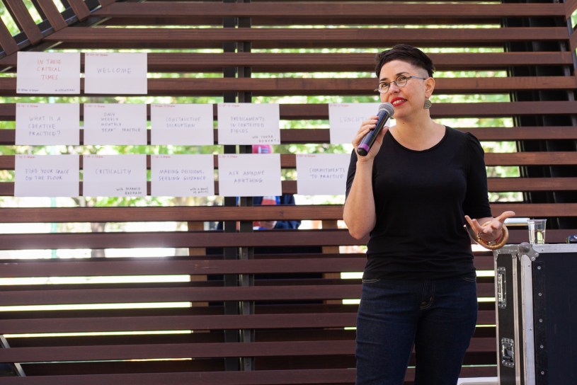 IMAGE: Esther Anatolitis presenting NAVA’s In These Critical Times at MPavilion in February 2019. Photograph by Daniel Gardeazabal.