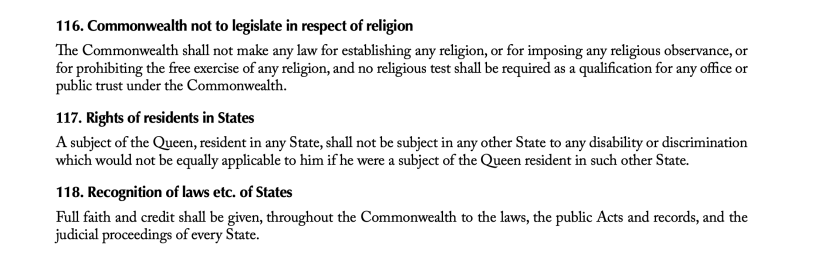 What does the Australian Constitution actually say? Here’s Section 116 in full: “The Commonwealth shall not make any law for establishing any religion, or for imposing any religious observance, or for prohibiting the free exercise of any religion, and no religious test shall be required as a qualification for any office or public trust under the Commonwealth.”
