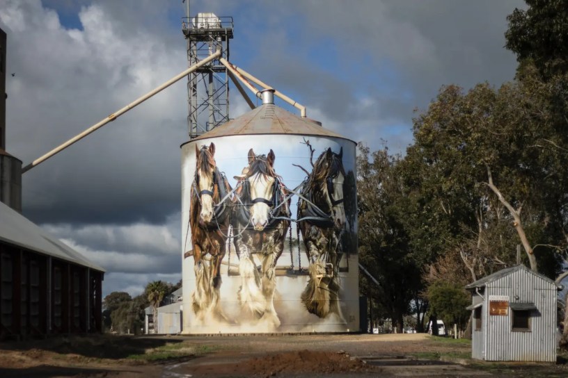 IMAGE: Jimmy DVate’s silo art at Goorambat, Victoria. Photo by Trevor Kay for ArtsHub.