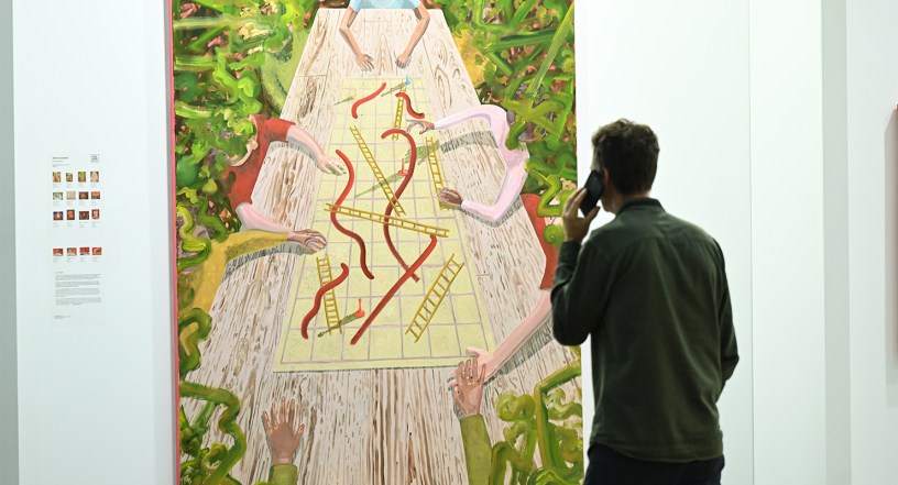 IMAGE: A person standing in front of ‘Snakes and Ladders’ (2024, oil on canvas, 183 x 152cm) by Amber Boardman at her 2024 Melbourne Art Fair exhibition (image: AAP/James Ross for Crikey).