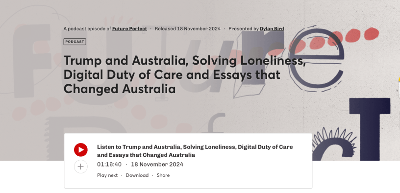 On Future Perfect with Dylan Bird: Esther Anatolitis, editor of Meanjin, and Jenny Hocking, Emeritus Professor at Monash University, chat about the release of Essays that Changed Australia, an anthology from Meanjin spanning its 84-year history. (46:24)