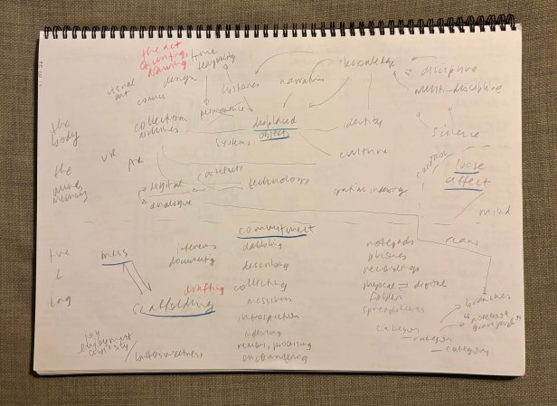 With a group of artists spanning a diverse range of practice modes, over two hours we analysed how we work and how we reflect critically on our practice. I mind-mapped as we spoke and drew.